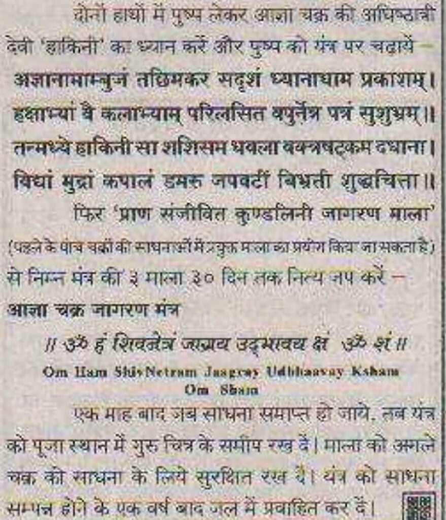 प्रतिष्ठित ‘आज्ञा चक्र यंत्र’ का स्थापन करें। अपने आसन पर